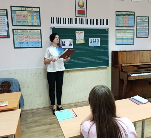 В классе учителя Беккр Оксаны Сергеевны состоялось мероприятие «Авторы Гимна Республики Беларусь». Учащиеся узнали историю создания главной песни страны, познакомились с творчеством авторов, посмотрели фильм о создании гимна. Юные музыканты активно отвечали на вопросы по теме, выполнили задание и в завершении мероприятия исполнили Гимн Республики Беларусь.